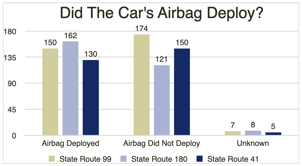 Number of Victims by Injury Degree, 2021; graph courtesy of author.[/caption]Did the Victim’s Air Bag Deploy During the Crash?Wearing a seat belt and riding in a vehicle with a properly-deploying airbag can save your life in a violent car crash. According to the National Highway Traffic Safety Administration (NHTSA), a frontal airbag is designed to open in a moderate to severe crash. Usually, this occurs during an impact with a fixed barrier at anywhere from eight miles per hour or higher. We were curious – how many car accidents on Fresno highways necessitated an airbag deployment? Using TIMS data, we were able to discover the number of crashes in which the collision victim’s airbag deployed. [caption id="attachment_4821874" align="aligncenter" width="600"]