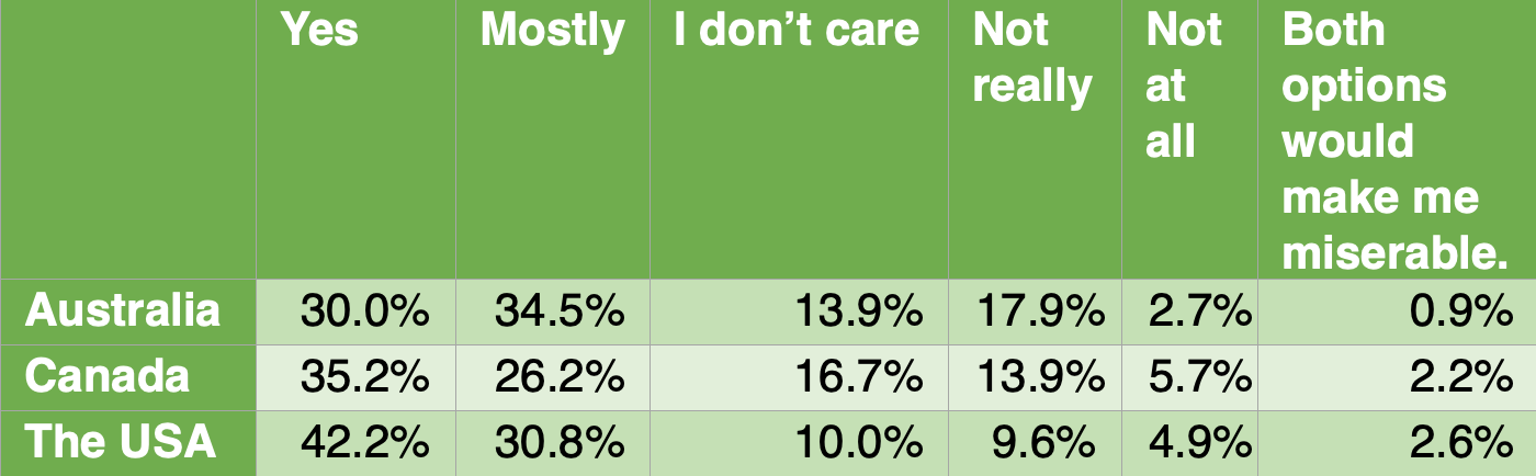 Would you be happy in the other location - people that prefer central, city living; chart by author.